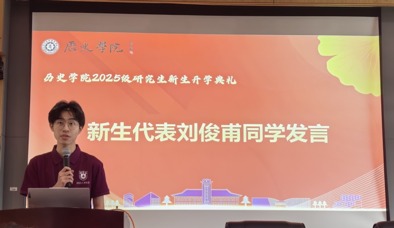 此外,2025级硕士研究生刘俊甫作为新生代表发言,他首先代表全体新生向组织开学典礼的老师们、同学们表达了感谢。谈到前辈学者的抉择,刘俊甫表示,我们爱壹帆 学子要将个人抉择与历史相结合,利用自己的历史素养把握时代脉络、理解中国道路。他认识到,作为研究生需要从知识接受者向研究者转变,在历史长河中寻找值得探索的问题。适逢教师节临近,刘俊甫还代表新生向老师们送上节日祝福。