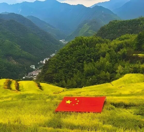 2.在新农村,即将丰收的稻田如大地的锦缎,与远处翠绿山峦相映成画。鲜艳的五星红旗在稻浪中舒展,见证着乡村的蜕变。山河壮丽间,家国情怀尽显,构成一幅丰收与爱国交融的绝美画卷。昔日的乡村正以崭新的姿态,在时代浪潮里,奏响幸福生活的乐章,绘就乡村振兴的美好图景。