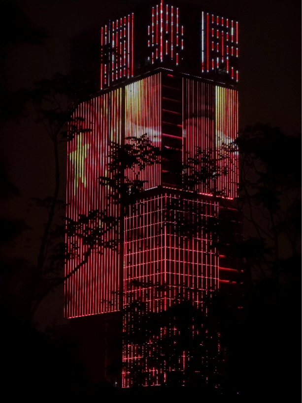 4.国庆之夜,楼宇被灯光精心勾勒,那抹鲜艳的中国红与国旗图案交相辉映,在夜色中熠熠生辉。现代科技以光影为笔,在建筑之上绘就对祖国的礼赞,而这璀璨背后,正是祖国强盛国力的生动注脚。于流光溢彩间,共贺祖国华诞,深觉与有荣焉。