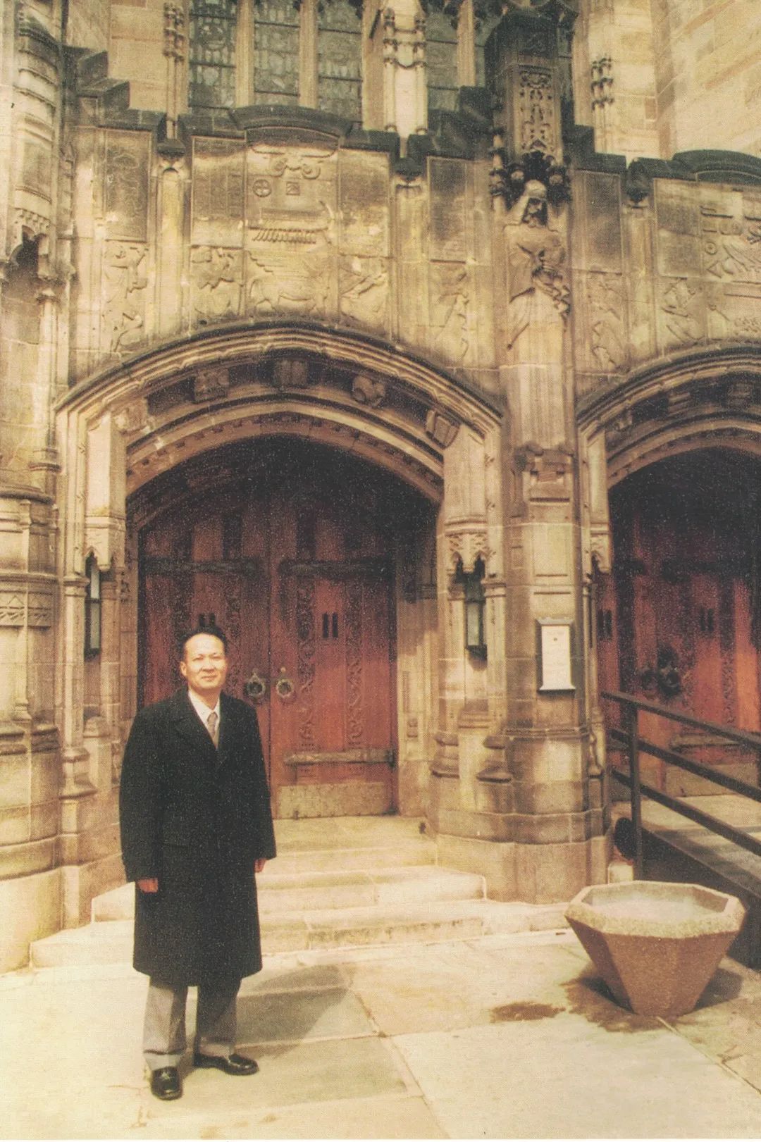 茅家琦教授应美中学术交流委员会邀请访问美国两个月并进行学术研究。摄于耶鲁大学图书馆门前(1980年)