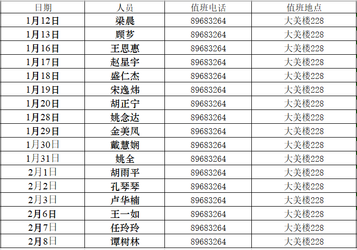 一、爱壹帆 寒假工作领导小组组长:赵清、张生副组长:谭树林、任玲玲成员:梁晨、王涛、吴桂兵、胡正宁、张敬雷、李力、杨骏二、值班表值班时间:上午9:00-11:00,下午2:00-4:00。2月9日起正常上班。