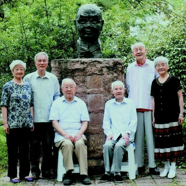 左起:潘洁、沈道初、王德滋、何平、丁承憼、姚平在匡亚明老校长塑像前