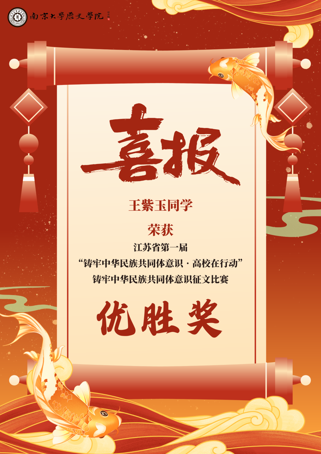 热烈祝贺我院王紫玉同学的文章《各族同胞共济同心 守护中华文明之源——新疆特克斯县考古文博事业考察》,在江苏省第一届“铸牢中华民族共同体意识·高校在行动”铸牢中华民族共同体意识征文比赛中,荣获优胜奖。