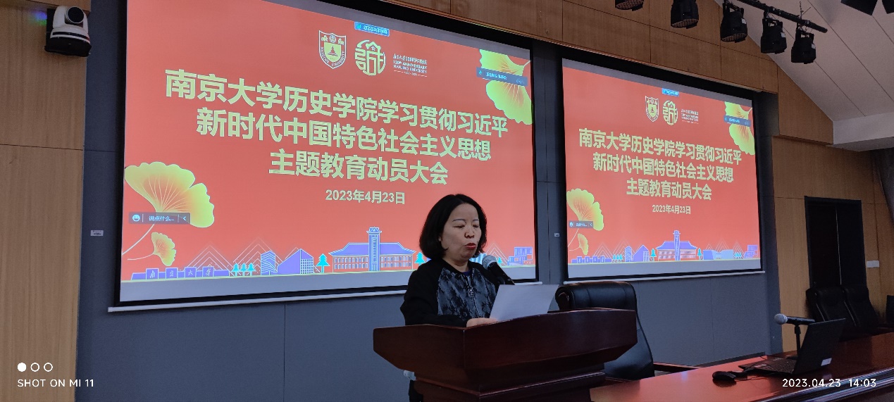 随后他详细解读了开展主题教育的总要求、根本任务、工作安排、五个目标和需要着力解决的六个方面突出问题,重点介绍了学院党委全面落实主题教育的实施方案和工作安排。他指出要充分利用各方面资源,扎实组织开展读书班、理论中心组集体学习、讲党课等,做到全面深入、全员覆盖,推动全院师生系统化、常态化学习习近平新时代中国特色社会主义思想;要组织全院党员、干部扑下身子、沉到一线开展专题调研,把学习和调研落实到完成党的二十大决策部署中去,落实到实施“奋进行动”的各项工作任务中去,落实到加快建设“第一个南大”的实践中去,从破难题、促发展,办实事、解民忧两个方面着力推进学院各项事业高质量发展。最后,他强调,全院领导干部及党组织要切实扛起责任,将学习贯彻习近平新时代中国特色社会主义思想主题教育工作与落实我校"奋进行动"、推动学院中心工作相结合,认真推进、务实求效。