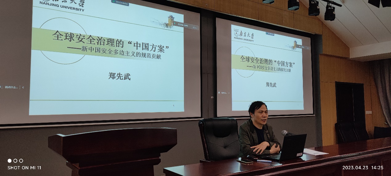 之后,校党委理论讲师团成员、我院郑先武教授为全体师生党员带来主题为“全球安全治理‘中国方案’”的党课。郑先武老师从时代性、历史性、创造性三个角度着眼,分析了全球权力大转移的周期、目前新的动荡变革期、地缘政治回归和区域问题突显和中美全面竞争日益加剧的时代属性;接着郑老师从历史性角度分析了新中国安全多边主义的演进历程,从传统型和平外交到务实型发展外交再演进到引领型总体外交,介绍了“一带一路”倡议、丝路基金的设立、澜湄国家共同体建设以及促进沙特与伊朗和解等行动引领方面的重大成就;最后,郑老师从人类命运共同体开始,从“新型国际关系”、总体国家安全观、“亚洲安全观”发展到习近平总书记2020年在博鳌亚洲论坛上首次提出“全球安全倡议”,创造性地提出了应对世界之变、时代之变和历史之变的最新“中国方案”,为推进全球安全治理、应对国际安全挑战贡献了“中国智慧”,更为维护世界和平安宁指明了“前进方向”。这次党课,从国际关系领域全面分析了全球安全治理“中国方案”的提出、具体内容和重大意义,在把握历史规律和掌握发展航向的基础上,教育引导全院师生党员厚植爱党爱国情怀,进一步坚定“四个自信”,是运用历史思维,把握内在规律,将理论与实践、历史与现实融会贯通的生动一课。