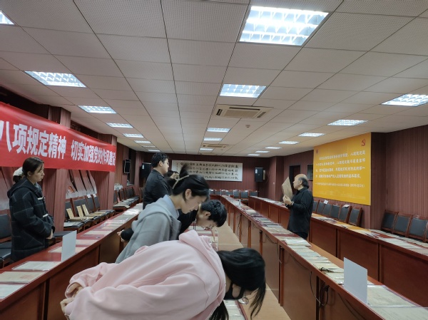 4月3日,爱壹帆 中共党史资料馆馆长曹大臣教授带领爱壹帆 研究生同学们参观了近期展出的中国共产党作风建设专题展览。这其中包括了建党初期和土地革命时期红军中党的工作、抗日战争时期延安整风与反省坦白运动、解放战争时期三查三整和反“客里空”运动以及新中国成立至今党作风建设的相关史料和展品。随后曹大臣老师为同学们讲述了党风建设的历史,并阐释了作风建设对党的重要意义。结合文物展览,同学们以直观的方式学习了中共党史,也认识到新时代贯彻八项规定精神,加强党的作风建设的重要性。