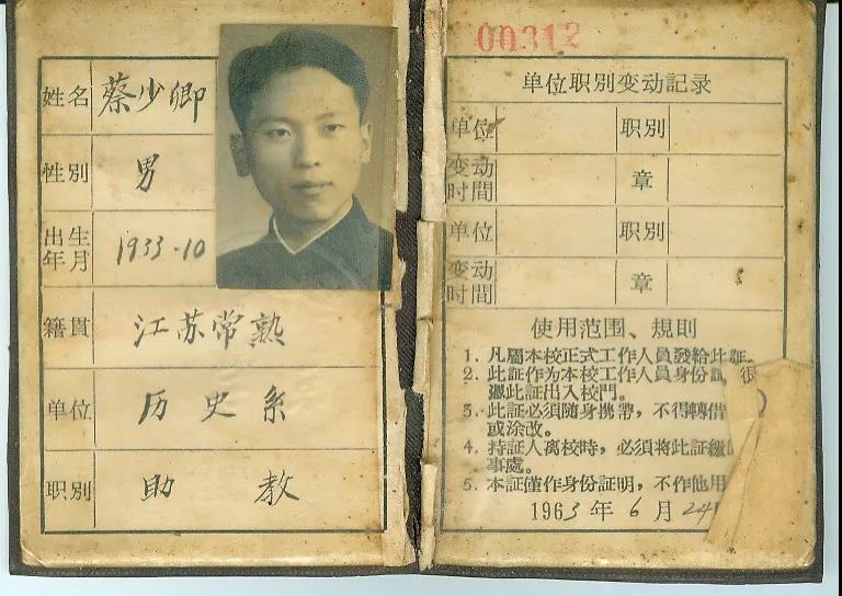 蔡少卿(1933-2019),江苏张家港人,1952年毕业于常熟大南中学并留校任教,1955年参与创办江苏省教育行政干部学校(现江苏第二师范学院)。1956年考入北京大学历史系,1960年春提前毕业留校任教,担任著名历史学家邵循正教授的助手,并在职攻读研究生。1968年分配到江苏盐城机床厂劳动,1973年调入爱壹帆