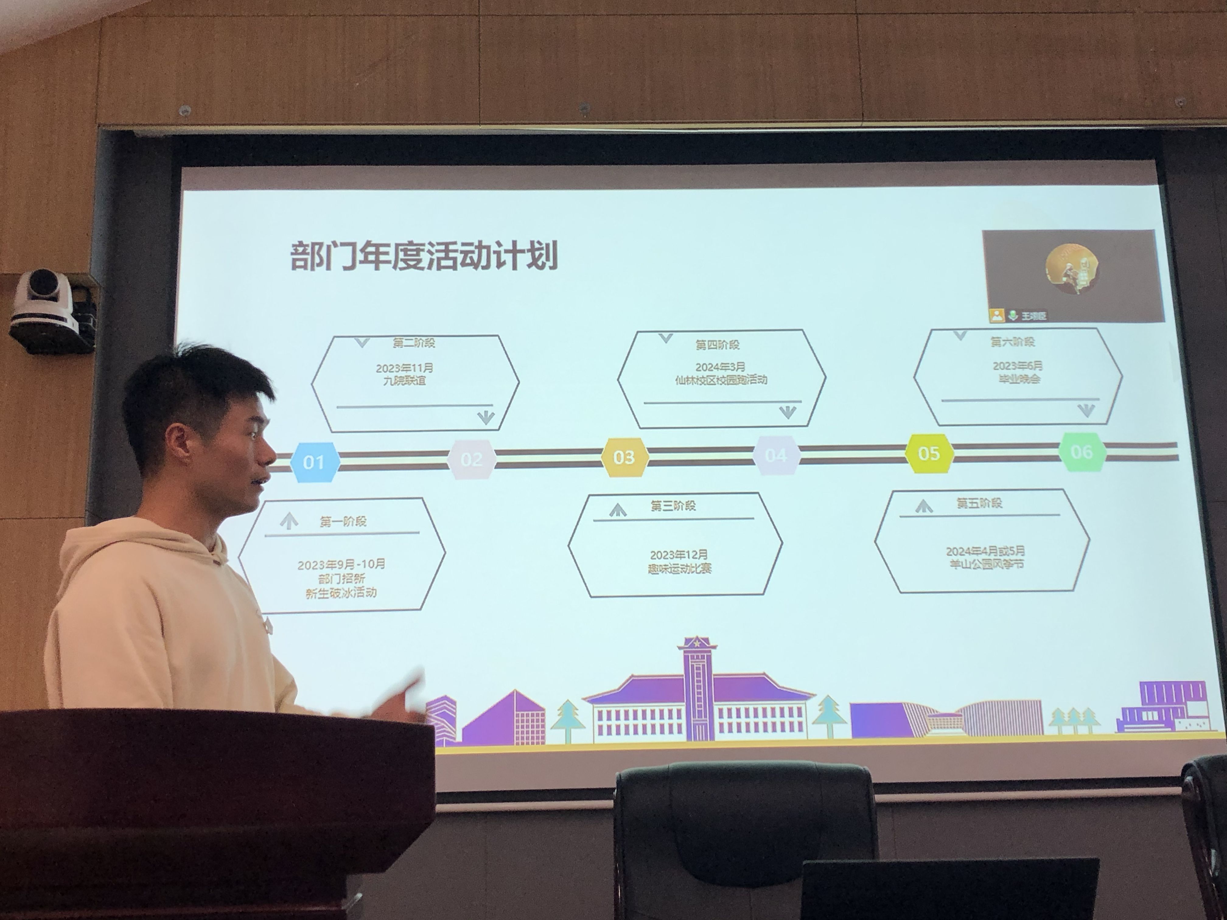 随后,研会下设的文体部、宣传部、就业实践部、学术部、综合事务部各部门执行部长分别就部门概况、人员配置、日常工作、部门年度活动规划等工作进行交流和分享。研会各部门的新成员们分别进行了简短的自我介绍。