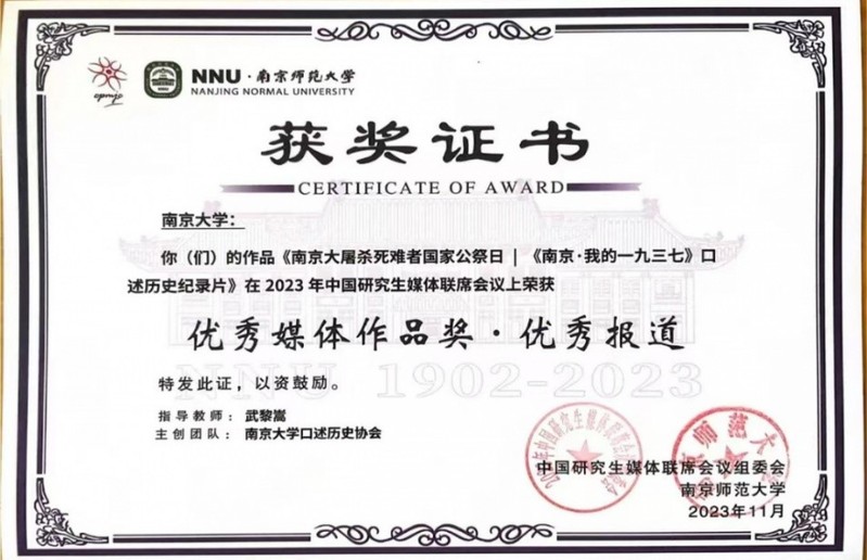 口述历史协会完成的《南京大屠杀死难者国家公祭日|〈南京·我的一九三七〉口述历史纪录片》报道荣获优秀媒体作品奖·优秀报道。