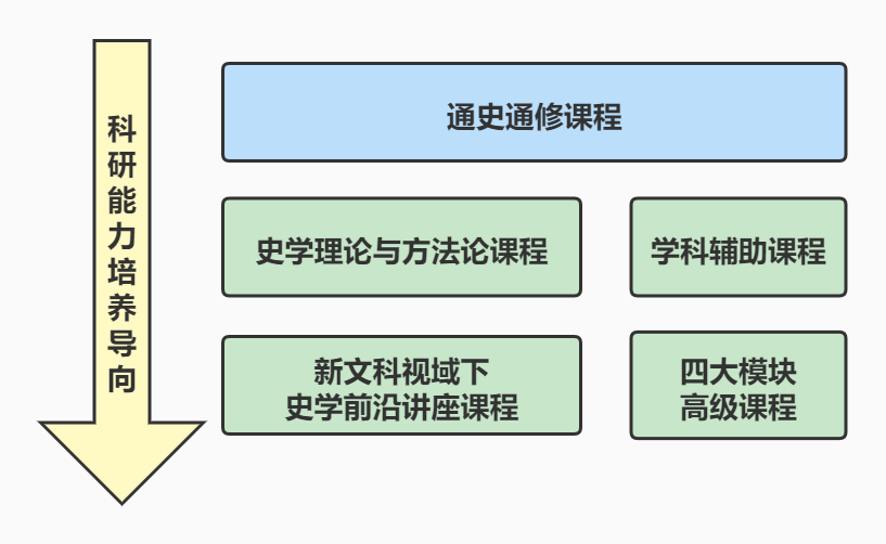 历史学专业“拔尖计划”课程设置体现新文科建设思路,秉承全面教育与个性化教育相结合的理念,在通史通修课程、史学理论与方法论课程、学科辅助课程基础上,设立包括四大模块高级课程、一个“新文科视域下史学前沿讲座”在内的新型课程体系。一是强调历史研究方法论课程,特别是引入诸如量化史学、口述历史、全球史等目前史学界比较重视的前沿方法论的训练;二是强化学科交叉,加强外语能力培训,即进入“拔尖计划”的学生有多种渠道获得包括英语、德语、法语、日语、拉丁语等在内的语言课程学习机会;在读期间,将为拔尖学生创造条件,申请进入国内外一流高校进行交换学习;三是建构“一四四”实践教学体系,积极开展内容丰富、极具特色的实践教学活动,培养学生的创新精神与实践能力。一种形式,即口述历史调研实践教学,拔尖学生通过参与口述历史的采集与整理,获得任务规划能力以及沟通能力的提升。四门课程,即(1)中国历史文化遗迹实践调研(2)重走一带一路实践课程(3)丝路遗产调研与保护(4)口述历史的理论与实践。通过这些课程,加强理论联系实际的修养,锻炼为当下经济社会建设进行智力支持的能力。四个竞赛,即(1)茅家琦史学论坛(2)全国及江苏省“挑战杯”竞赛(3)全国口述历史成果交流赛(4)国际模拟联合国交流赛。通过竞赛,实地锤炼、提升学生学以致用、解决现实问题的能力,为讲好中国故事做预备工作;四是突出研究引领,配备名师导学,引导学生在参与导师科研项目过程中获得指导和训练。