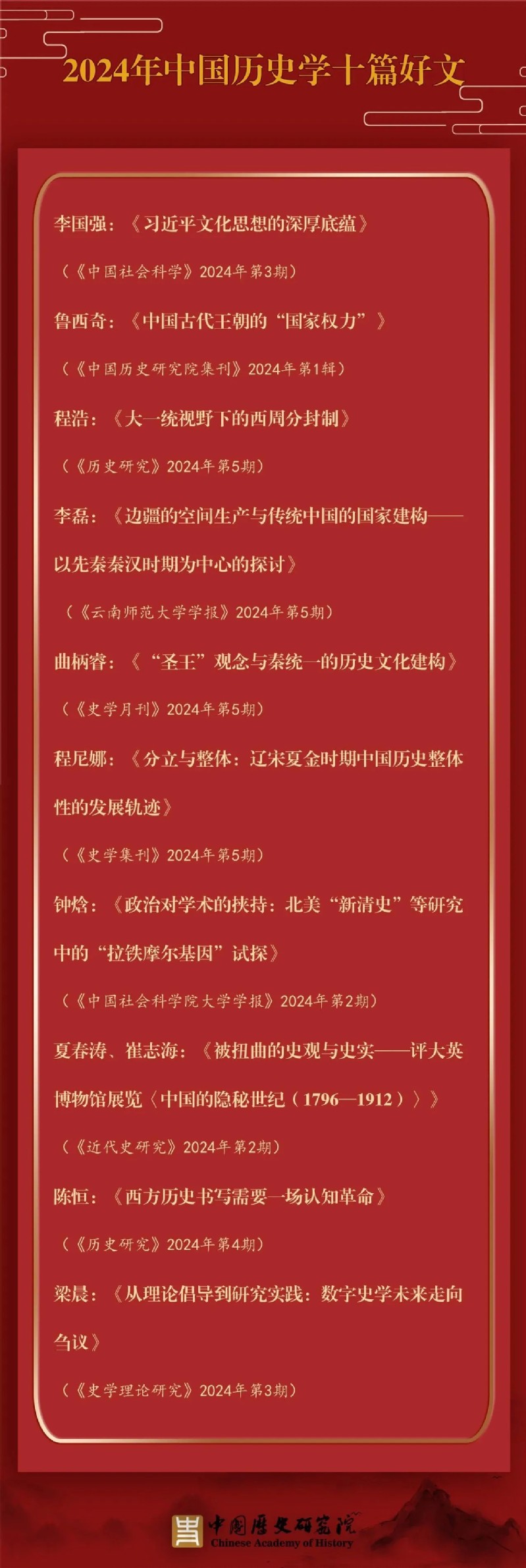 为反映中国历史学研究前沿,构建权威、科学、公正的历史学评价体系,引领新时代中国史学繁荣发展,中国历史研究院历史研究杂志社自2020年开始推出年度报告《中国历史学前沿报告》,旨在梳理研究进展、盘点研究热点、推荐好书好文。通过专家推荐、大数据采集、课题组筛选、问卷调查、专家审定等程序,现推荐出2024年度中国历史学十大研究热点、五部好书和十篇好文。近日,中国历史研究院正式公布“2024年中国历史学十篇好文”入选名单,我院梁晨教授论文《从理论倡导到研究实践:数字史学未来走向刍议》成功入选。