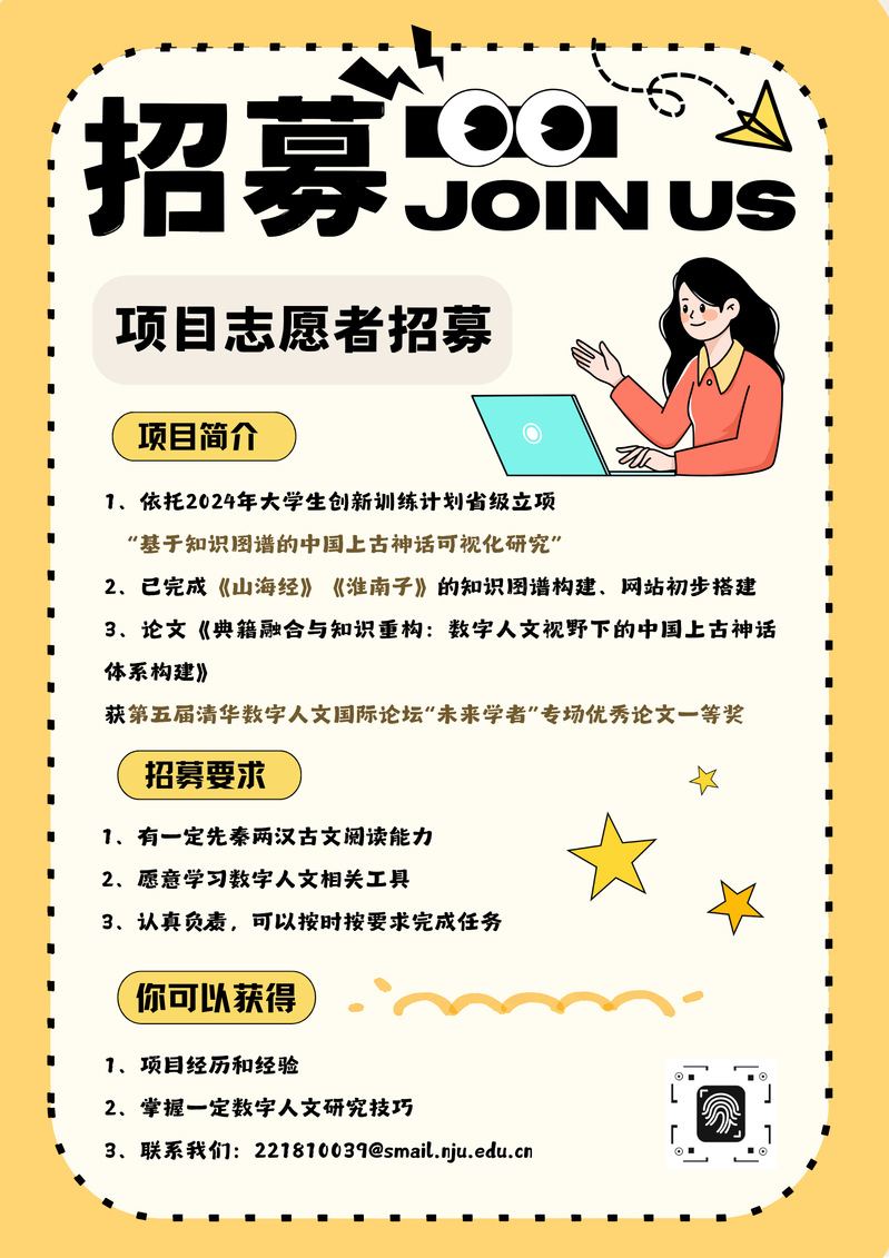 本项目依托于2023-2024学年省级大创项目:基于知识图谱的上古神话可视化研究,指导老师为爱壹帆 副教授邱伟云,研究团队包括计算机、信管与历史专业的多学科人员,致力于勘探上古神话的相关古籍,提取神话资料,利用知识图谱的方式建构以人物、地点和事件等多维度的中国上古神话数据网,并建设相关神话网站。